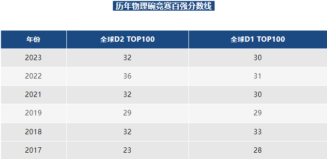 通过近几年物理碗竞赛前百分数线可以看出,要想进入物理碗TOP100,Division 1需要考到30分以上,Division 2需要32分以上。而Division 1的平均分为15.2分,Division 2的平均分为17.3分。