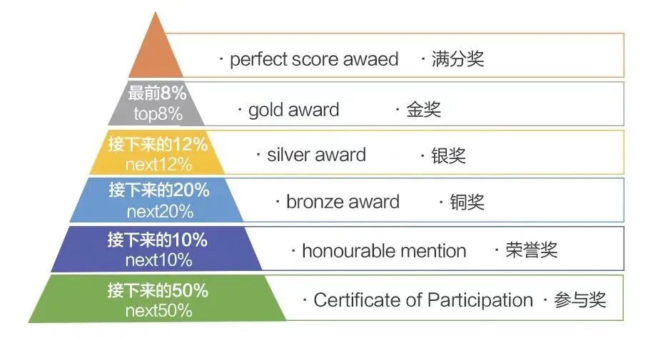 SASMO共分为 6 大奖项,分别是满分奖-金奖-银奖-铜奖-荣誉奖-参与奖。40%的参赛学员可以获得铜奖及以上的奖项。