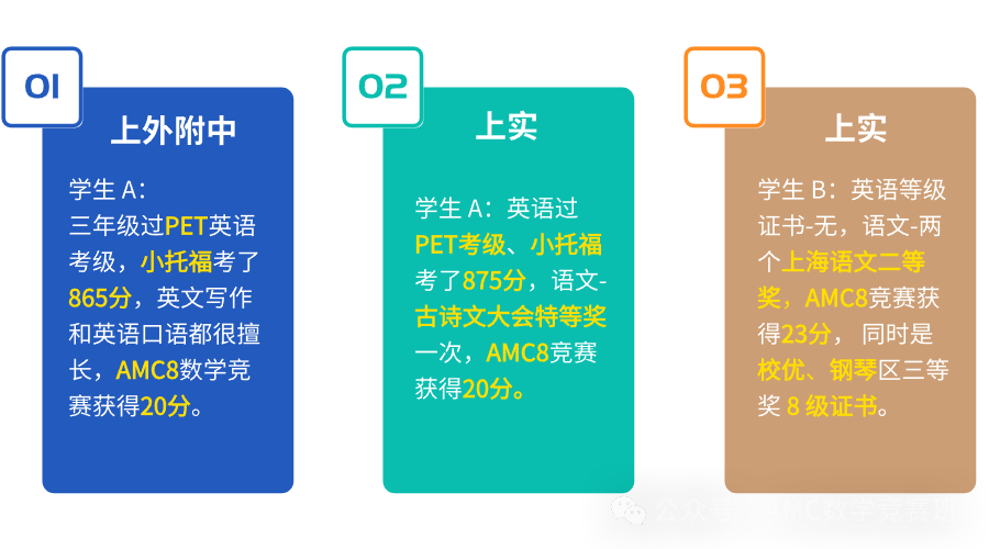尤其是上实重视理科思维,那么拿到AMC8竞赛前1%奖项,更有优势,对于重视英语能力的上外来说,小托福考到860+,拿到上外面单的概率更大。