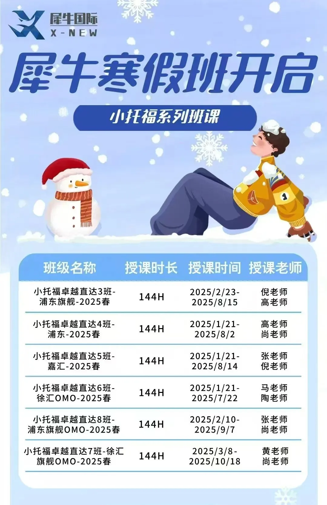 针对2025年小托福考试在即,犀牛教育开设了小托福寒假班,让孩子在寒假冲刺卓越865+!