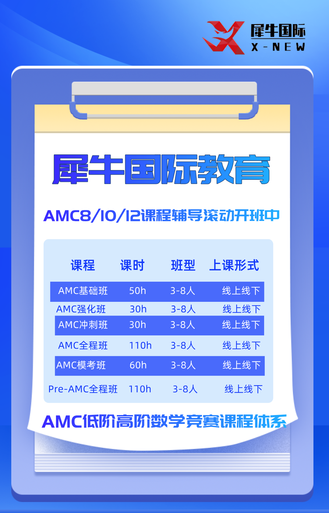 犀牛国际教育针对想要提高数学成绩,提升综合素质和竞争力的学生,根据学生的不同基础,开设了定制化1V1辅导课程,线上线下结合授课,班型采取小班模式,设置有基础班,全程班,强化班,冲刺班,模考点评班等,助力孩子在AMC8竞赛中脱颖而出!