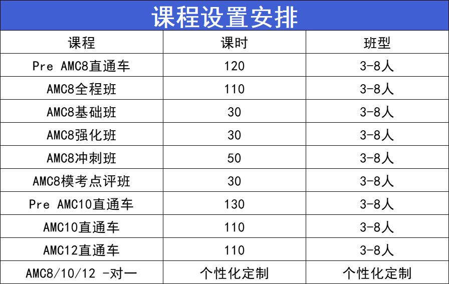 我们根据前测卷成绩,针对学生,开设AMC数学竞赛全程班、基础班、强化班、冲刺班多个类型的班课。