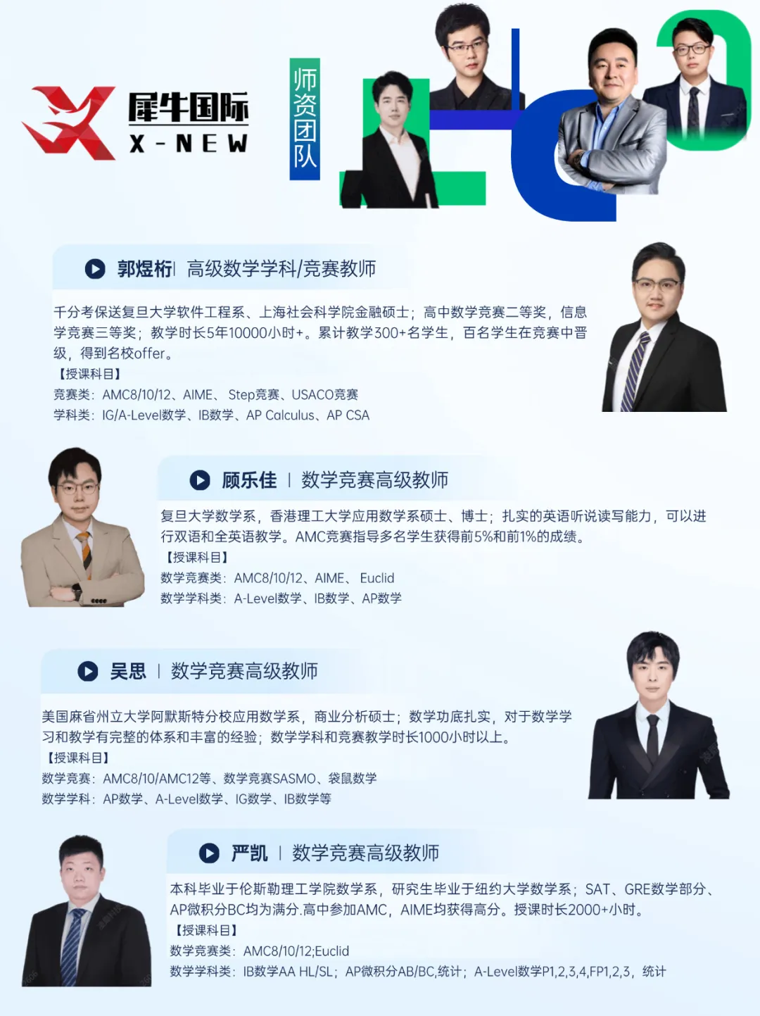 犀牛国际的教学团队功底扎实,经验丰富,毕业于海内外名校,科班出身,竞赛经验丰富