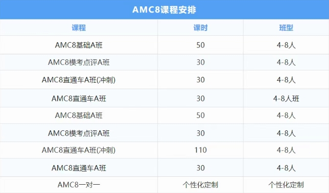 准备时长:3个月-6个月,可以选择AMC8强化冲刺班或冲刺辅导班!