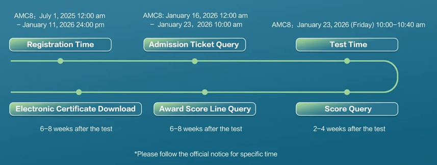AMC 8(American Mathematics Competition)由8年级及8年级以下学生参加。考试时间为40分钟,一共25道单选题,难度由浅至深,答对一道加1分,答错不扣分,满分25分。2025年考试时间为1月23号10:00-10:40。