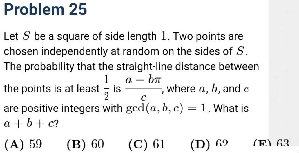 中文题意:S是一个边长为1的正方形。在此正方形的任意边上任意取两点,这两点之间距离最小为1/2的概率是(a-bπ)/c。a,b,c是正整数且最大公约数为1。求a+b+c=?