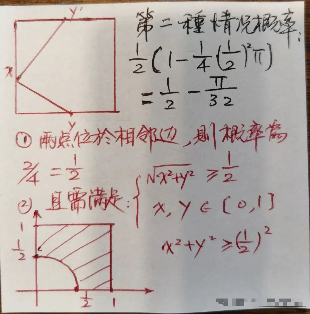 第三种情况:两点位于对面的边上。这种情况比较简单。如果位于对面边上,可能性为1/4,这种情况距离最小为1,最大为√2,全部大于1/2符合要求。因此第三种情况的概率就是1/4。