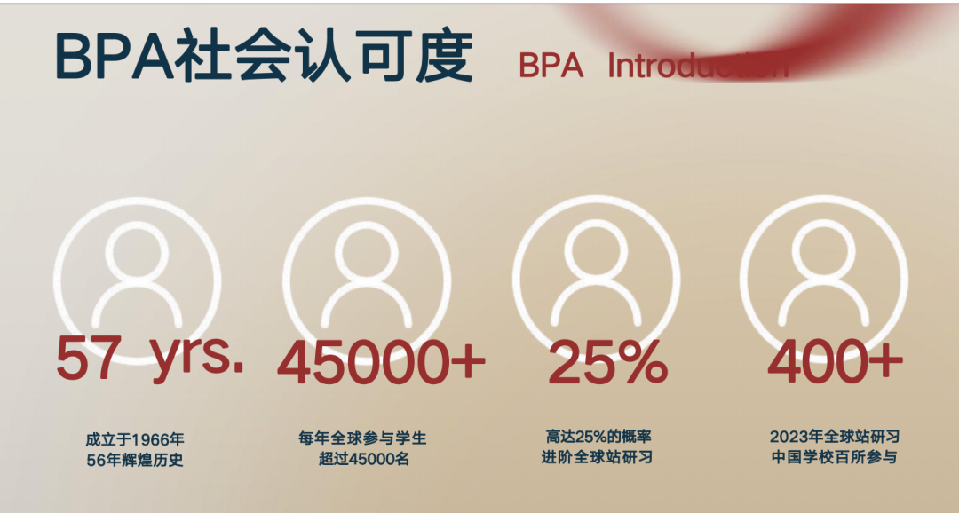 BPA业全能挑战,被授予美国教育部(USED)和生涯规划教育协会(CTSO)官方认证,并由中学校长联盟(NASSP)推荐,是针对商业管理、信息技术、财务会计等方面的中学生商科学术活动。