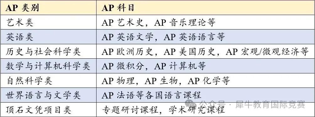 AP 课程共有38门学科,分为7个大类,包括艺术、英语、历史与社会科学、数学与计算机科学、自然科学、世界语言与文化以及顶石文凭项目。