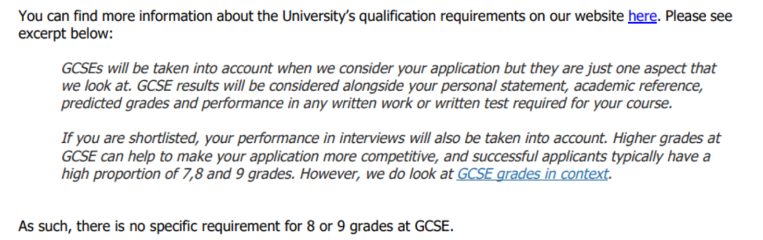 比如剑桥大学,官网虽然没有对GCSE成绩作出明确要求,但GCSE仍然会作为录取指标之一,结合学校或学院整体成绩背景综合考查;