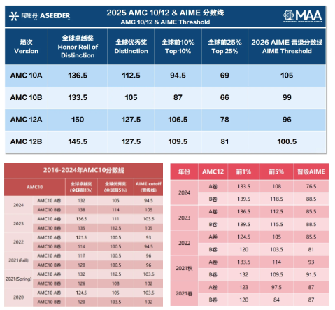 对比近几年AMC10/12分数线,现在想拿AMC10前1%至少要126+,AMC12前1%得132+;想稳进AIME,AMC10至少冲99+,AMC12得100+,比5年前整整多要对3-4道题!