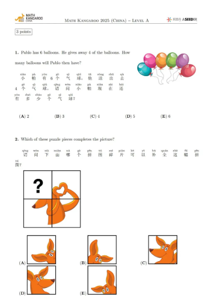 袋鼠竞赛每个等级考察的数学知识点都不同,学生可以报自己目前所在年级及以上等级的组别参赛。
