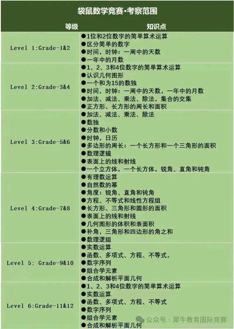 袋鼠数学竞赛个等级难度逐步增加,侧重以下知识点: