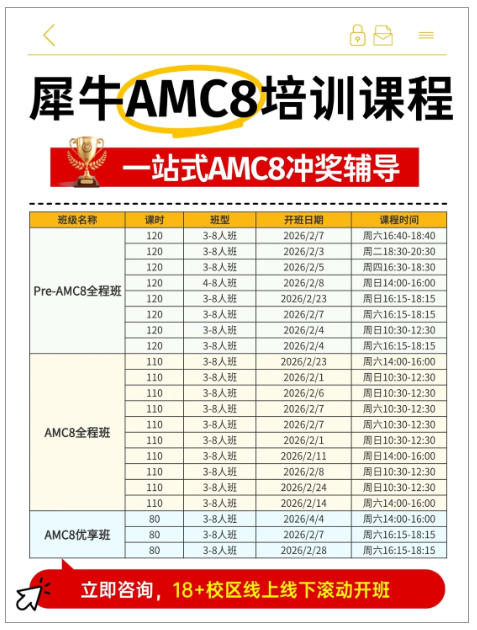 犀牛教育针对AMC8竞赛开设了Pre AMC8全程班、AMC8全程班、AMC8优享班、AMC8冲刺班,3-8人精品小班或者1V1授课均可