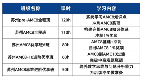 犀牛教育在苏州工业园区、新区均有线下校区,针对AMC8课程开设多个班型课程,课程内容及难度阶梯式递进,适合G3~G8学生