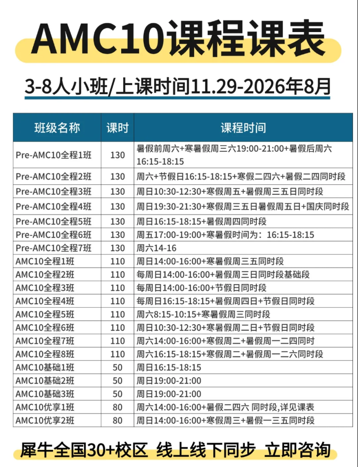 7-8年级由于知识点缺的比较多,可以通过学习Pre AMC10来补足知识点,直通全球1%;对于9-10年级的学生来说,可以直接学习AMC10课程。以下是课程详细介绍