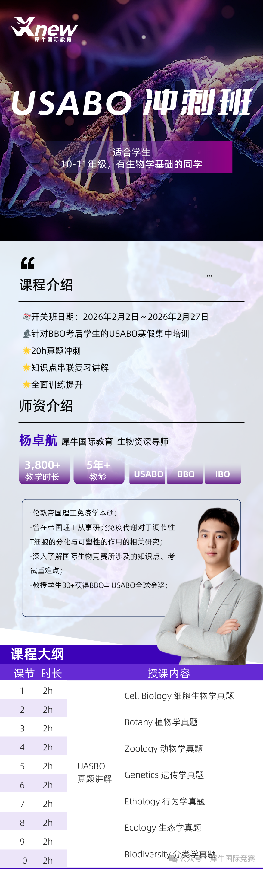 我们为有志于参加BIO-USACN的学生设计了系统化培训课程,内容涵盖全部考纲知识点,搭配真题训练与模考点评,帮助学生在有限时间内高效备考,冲刺奖项!
