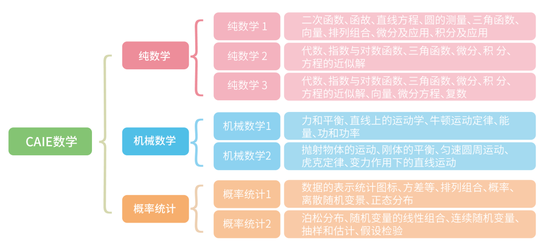 CAIE的数学主要包括Pure Math 纯数,Mechanics 力学,Statistics 统计学三个部分,每个大板块下有不同的单元可以选择。