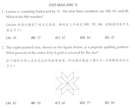 国内双减后绝大多数比赛都禁止了,AMC的试卷也都演变成双语模式,英语也成了糖衣炮弹(下文中会有2025年真题),谈不上英语学习,但好歹合法合规了。