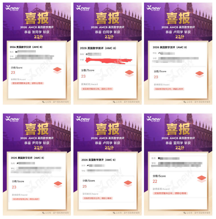 26赛季AMC8竞赛出分,犀牛教育多名学生拿到了23分的好成绩,还有部分同学更是取得了AMC8满分25分的好成绩!