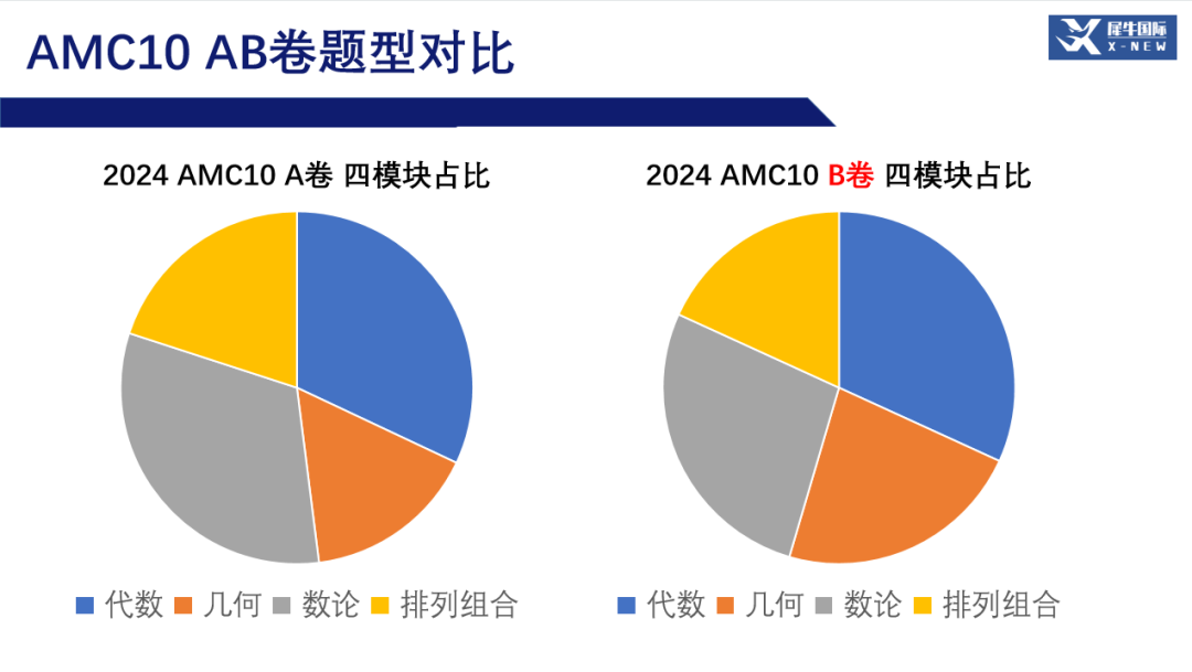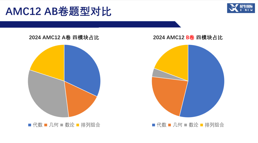AMC12考试与AMC10考试的题目与考察范围有很多重合的地方,以代数、几何、数论、组合四个模块的知识为主,但核心知识层面上多出了对数、三角函数的计算与图像、复数三个知识模块的考察,并且这三个模块在AMC12中几乎100%会出题考察。
