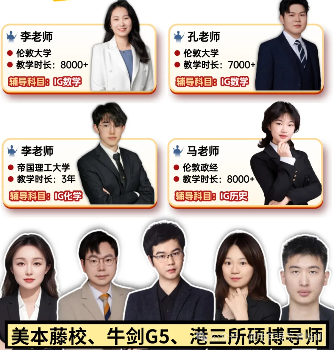 犀牛IGCSE授课师资,包括藤校G5、港前三、新国立等QS前50等名校硕博导师,老师们人均4000+的授课时长,积累的丰富授课经验,能够精准找到学生基础薄弱点,从根本出发,扎实根基,实现稳步提升成绩的学习目标。