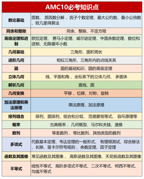 摘要:AMC10新赛季备考已经开始了,AMC10都考什么? 准备今年参加AMC10竞赛的同学,在备考开始一定要搞清楚这些问题,本期内容带大家一起看AMC10知识点都有哪些 AMC10竞赛知识点汇总 AMC10竞赛