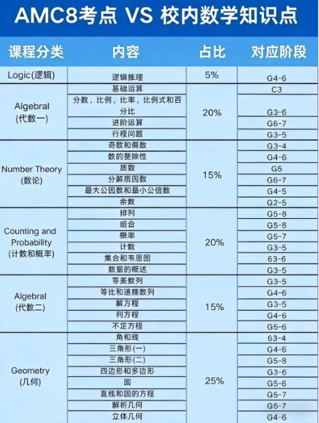 AMC8竞赛包含代数、几何、数论和组合四大模块,其中一部分是小学数学的延伸,另一部分则是初中数学的“提前预习”。