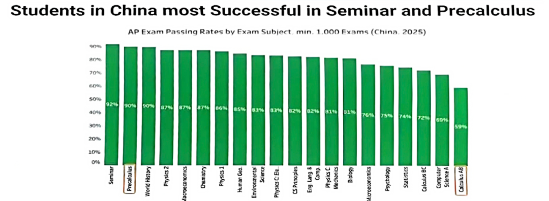 在所有AP科目中,AP Seminar学术研讨(92%)和预备微积分(90%)是中国学生获得3分及以上最高的两个科目。AP微积分AB则排在榜单末尾,中国学生通过率仅有59%。