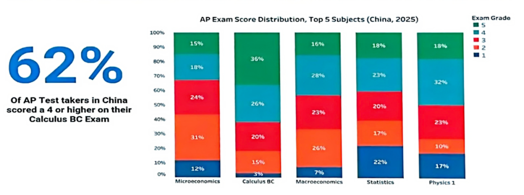 根据College Board公布的数据显示,中国考生的科目 “理工商科倾向”非常明显,最受欢迎的五大科目分别为:微观经济学、微积分 BC、宏观经济学、统计学、物理1。而在这5个AP科目中,仅统计学(18%)略超全球平均(17%)。其余热门科目中,微积分BC中国考生5分率(36%)显著低于全球水平(44%)。