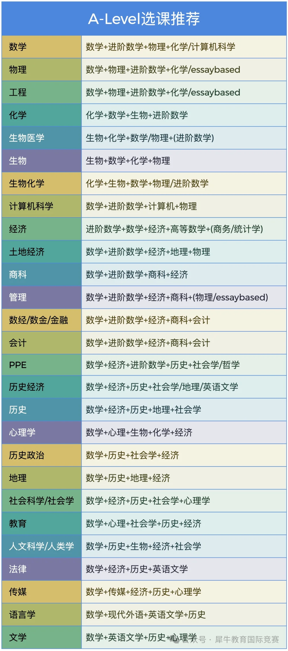 ①未来专业方向:为了能够更好地匹配未来院校专业,建议选课时可以在其官网上查询该院校专业对于Alevel的选课要求。