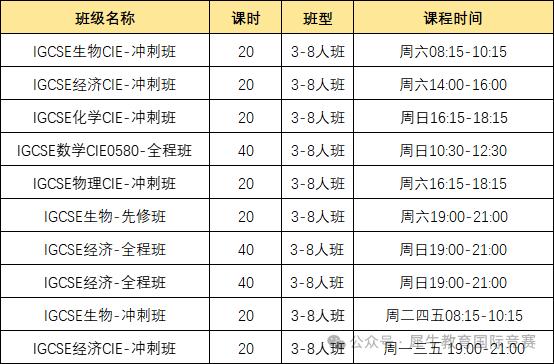 IG/A-Level都到了要大考的阶段,不管现在正处于哪个阶段同学,都要加快备考速度。犀牛IG/A-Level近期新开班安排如下,多种班型可匹配不同阶段的学生。