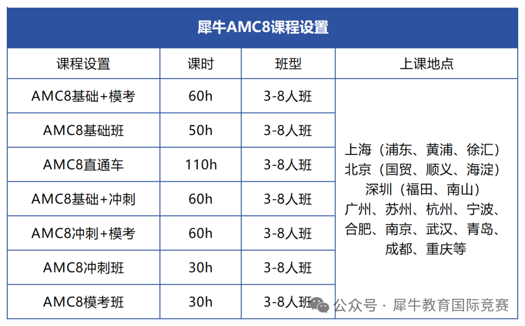 犀牛针对AMC竞赛设置多种培训课程,包含基础、强化、冲刺三大阶段,可根据孩子基础精准匹配适合的班型。课程线上线下同步授课,详细了解添加V:xnew0918。