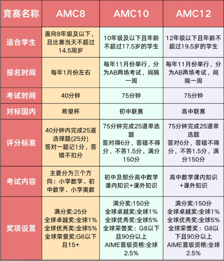 美国AMC竞赛分为AMC8/AMC10/AMC12竞赛三个不同阶段的竞赛。不同阶段的学生可规划不同的AMC数学竞赛。