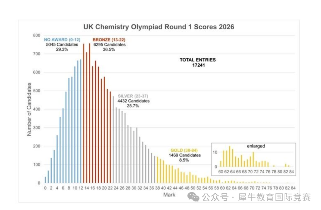 UKCHO竞赛分数线解读:相较于往年,2026年UKCHO竞赛试题整体难度有所下降,增加了试卷基础得分题的占比,考点更侧重Alevel前期知识点,难度的降低也导致今年UKCHO竞赛获奖分数线的上涨。尤其是金奖分数线直接从去年的29分飙升至38分。
