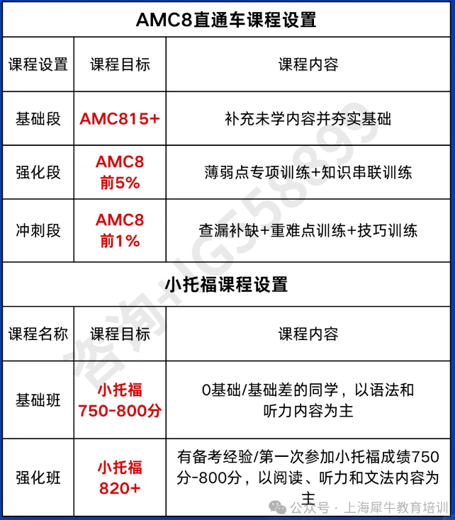 上海犀牛在浦东区、黄浦区、徐汇区、闵行区等5个校区开设【AMC8+小托福】培训课程,距离不方便的可以上线上课,服务师资等与线下一致~