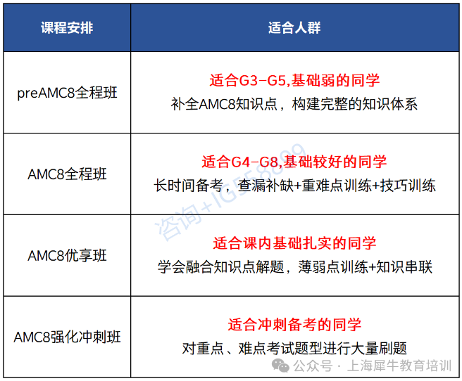摘要:暑假马上要到了,又是一个集中学习的黄金时间,犀牛教育AMC8培训班火热上线,特此推出:适合1月冲考AMC8竞赛的AMC8冲刺班,适合长线备考2027年AMC8竞赛的preAMC8全程班和AMC8全程班;课程