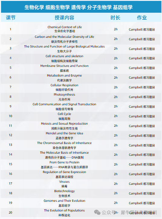 犀牛生物竞赛直通车,以120h课程整合高中阶段9大国际生物学竞赛,以Campbell-Biology为教学主体,进行大学生物学课程学习,构建完整的系统性生物学学科知识体系。