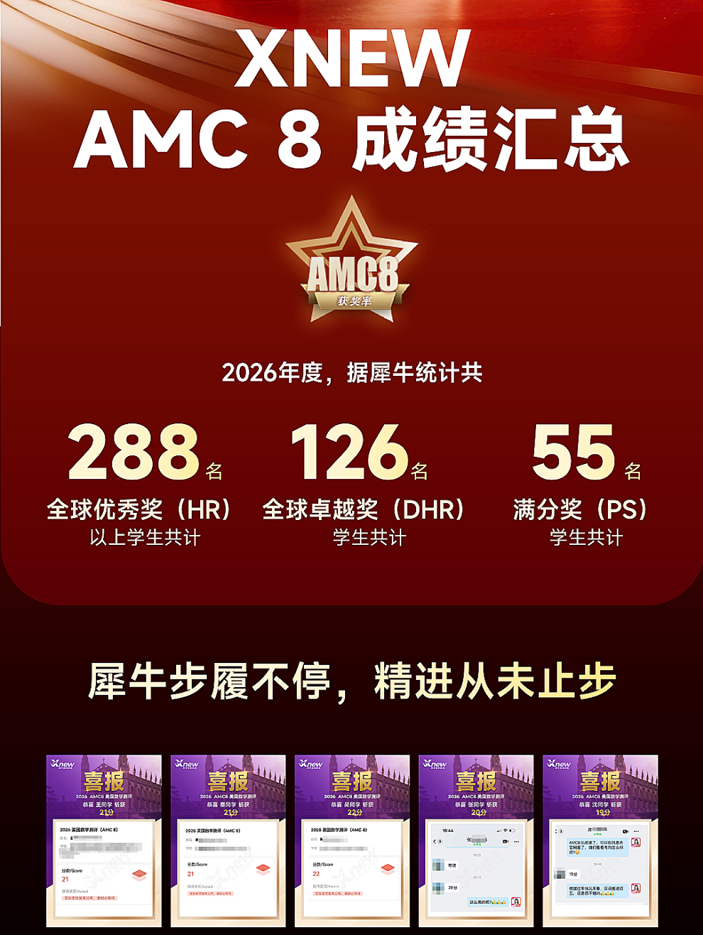 犀牛历年 AMC8 竞赛喜报频出,众多学员斩获全球前 1%、前 5% 奖项,高分上岸率稳居前列。也有很多家长反馈,孩子跟着专业老师系统学习后,解题思路清晰不少,竞赛成绩提升明显,择校也更具竞争力。