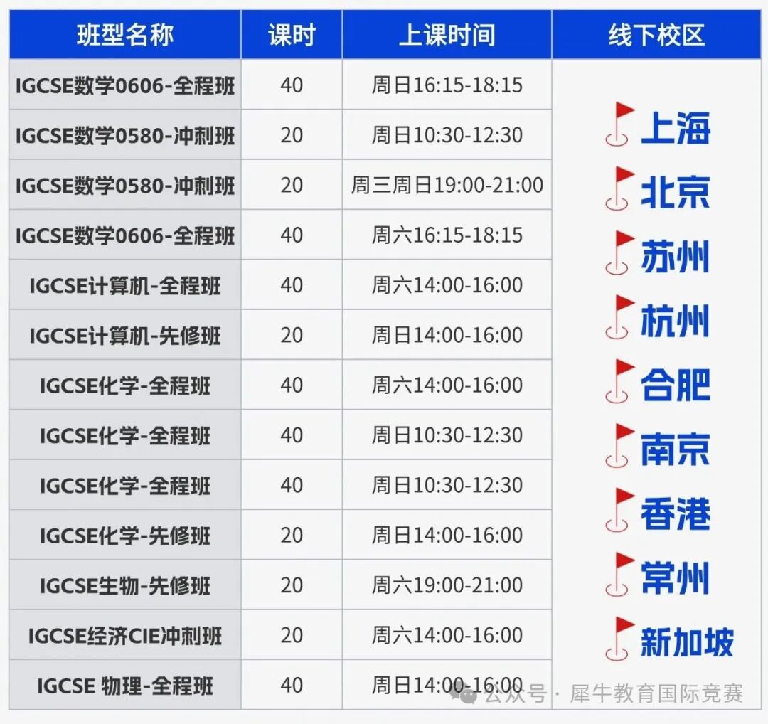犀牛在海内外均设有直营校区,包含:上海(浦东、徐汇、黄浦)、北京(海淀、国贸、顺义)、广州、深圳(南山、福田)、苏州、杭州、成都、重庆、南京、青岛、无锡、武汉、合肥、宁波、天津、常州、香港、新加坡等,可提供线上/线下IGCSE培训辅导课程!