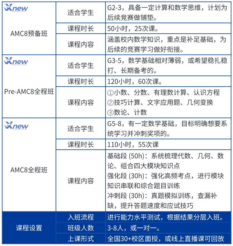 AMC8入学先进行能力水平测试,根据结果分层入班。支持3-8人小班或一对一,全国30+校区面授,也可选择线上直播课(支持回放),流程清晰,灵活适配。