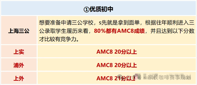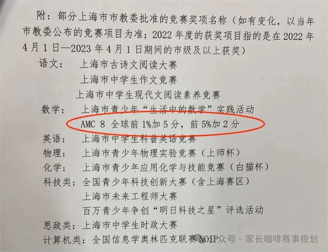 ①上海市教委发布的文件中,指出AMC8竞赛成绩可在升学考试中加分,AMC8全球前1%加5分,前5%加2分。