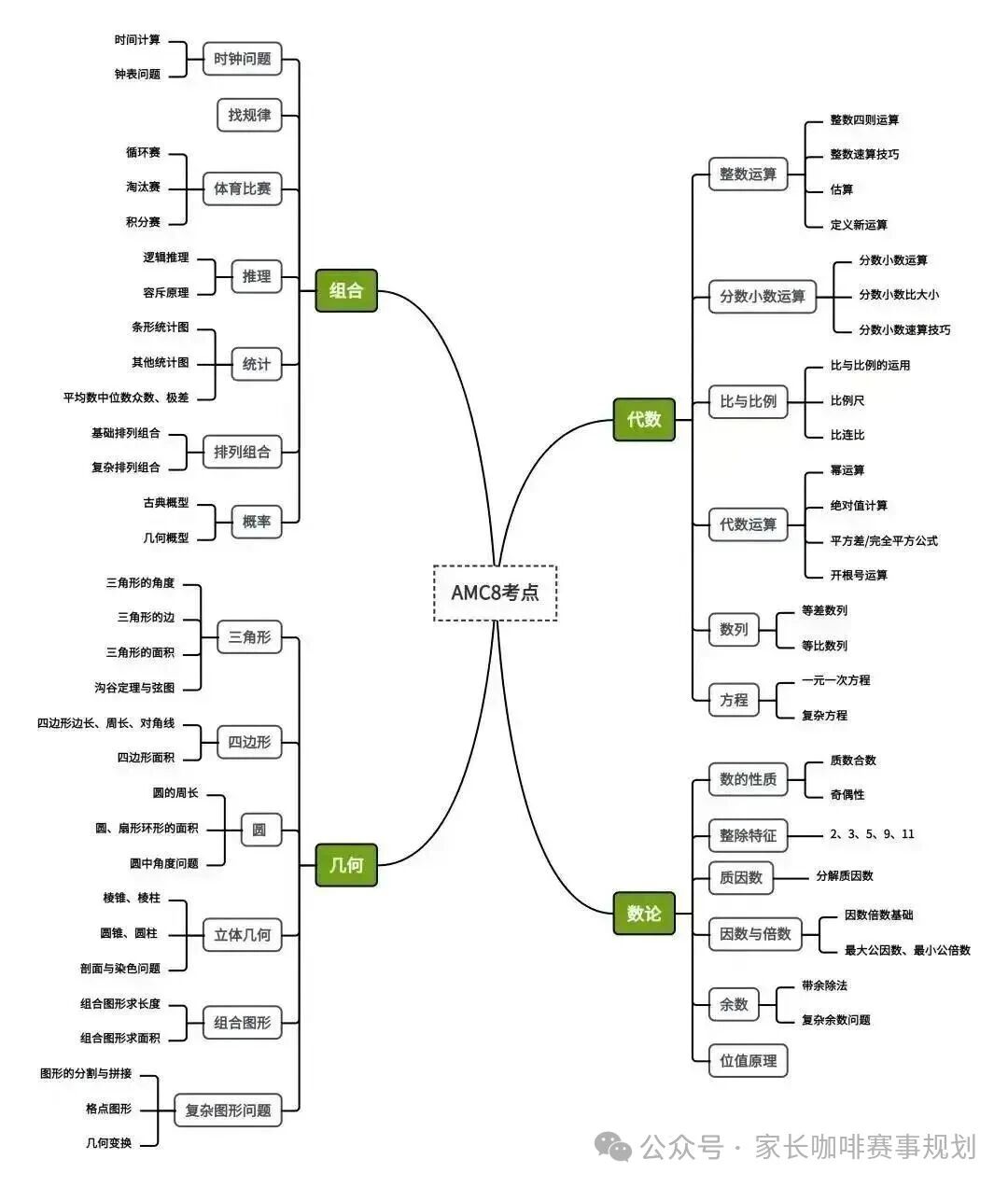 AMC8竞赛的考试内容会涉及到各个年级的数学知识,包括计算、应用题、几何、计数、组合数学、数论、其他等。