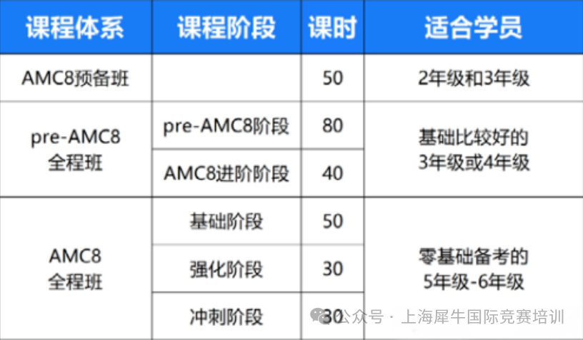 犀牛有多年AMC8数学竞赛培训经验,形成了完整的AMC8竞赛课程体系。犀牛针对4-6年级零基础备考AMC8竞赛学员开设110h直通车课程,覆盖AMC8竞赛全部考点知识,高效突破低龄学员AMC8竞赛备考难点。