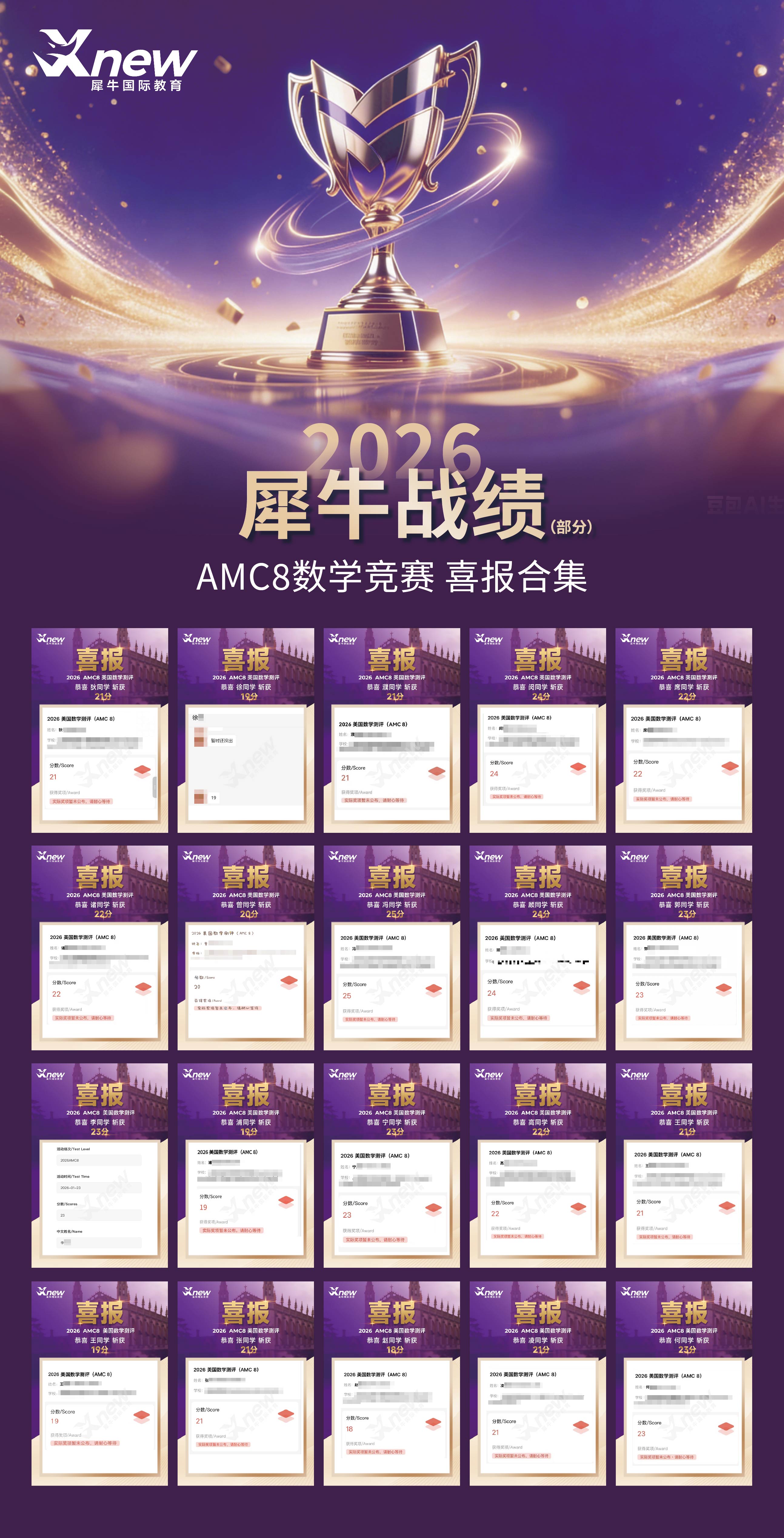 看了上方的内容,相信大家大家对犀牛的AMC8 竞赛更有信心了。从全球前 1% 的高分学员,到零基础稳步提分的孩子,每一份喜报都是实力的见证。我们犀牛用顶尖师资、全阶段班型与小班精准辅导,帮孩子高效备考、冲刺奖项,用实打实的成绩说话。