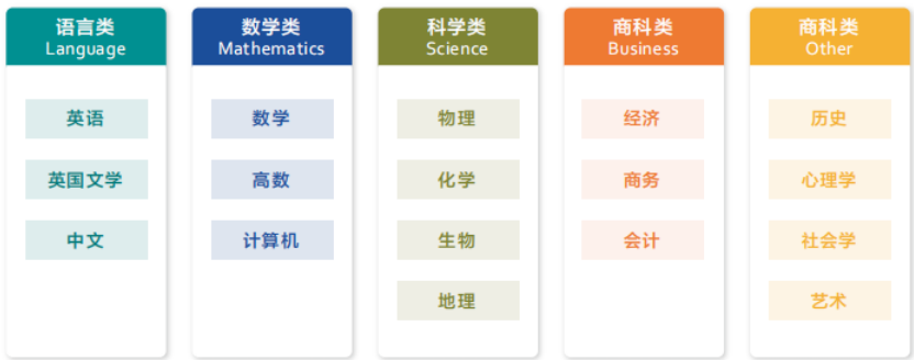 文科:中文、英语、地理、历史、政治、社会学、心理