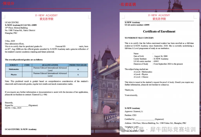 犀牛教育作为UCAS官方认证中心,可以为学员直接提供预估分和在读证明。