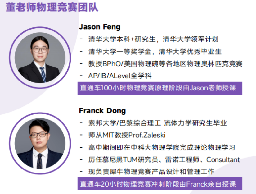 犀牛物理竞赛由清华本硕名师 Jason 老师 + 索邦大学背景的 Franck 老师强强联合授课,既能帮你打牢竞赛原理基础,也能精准带冲刺阶段提分,懂教学更懂竞赛。