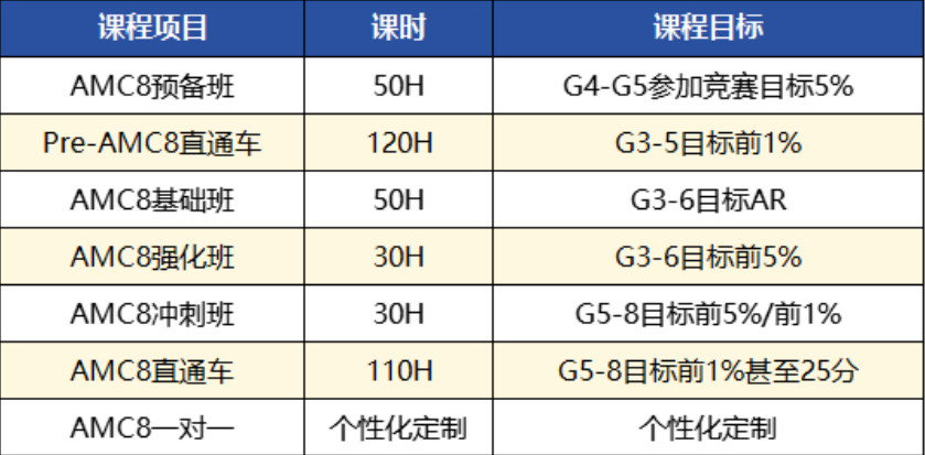 深圳犀牛教育AMC8课程包含Pre AMC8直通车、AMC8基础班、AMC8强化班、AMC8冲刺班以及AMC8全程班等不同班型,针对G2-G8备考AMC8竞赛的同学,均有适合的课程选择~