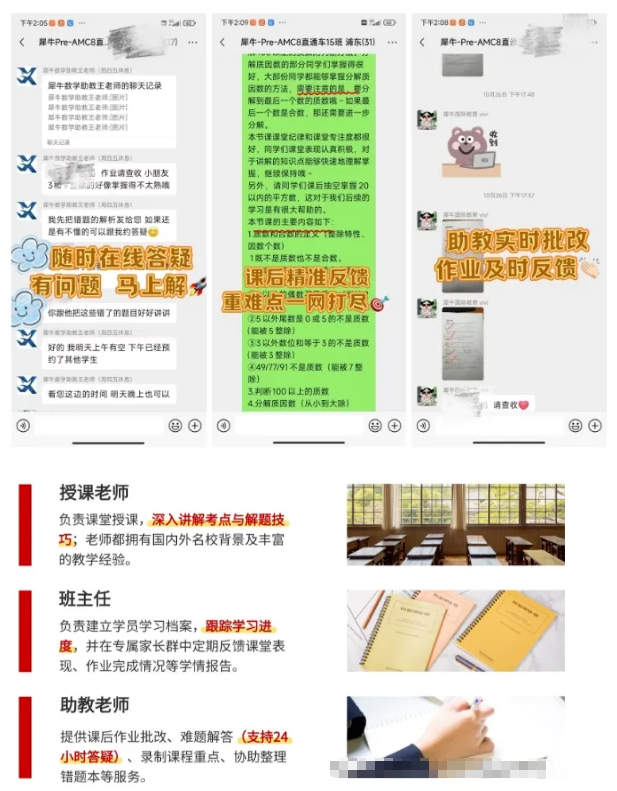 全程督学反馈:每位学生有专属AMC8学习群,班主任+助教+授课老师三方跟进:课前提醒、作业批改、答疑解惑、学情反馈,家长随时掌握进度。
